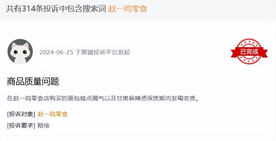 黑猫投诉平台上,多位消费者投诉在零食很忙的零食中吃到了虫子、橡皮筋等异物,还有不少消费者买到了变质发霉的鸭腿、鸭脖、面包等。赵一鸣零食也出现过同样的问题,黑猫投诉平台上,赵一鸣零食相关的投诉超过300条。除了一些是因为服务态度,大部分都与食品安全问题有关。小红书上,也有多条曝光赵一鸣零食存在食品安全问题的帖子。