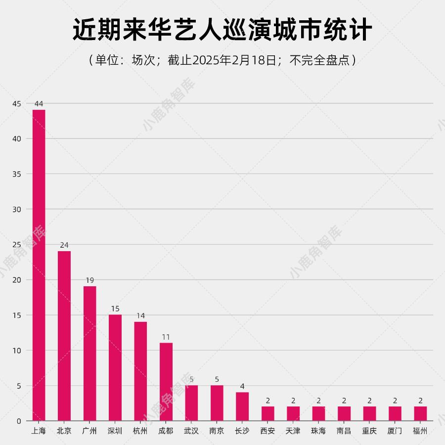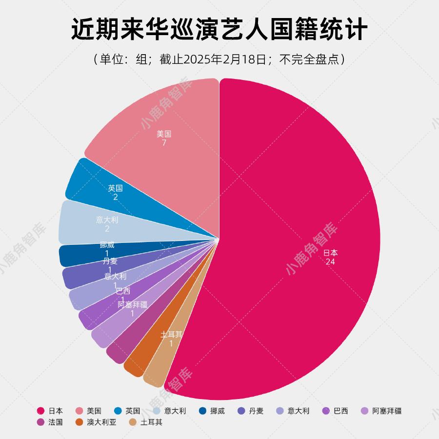 本文是2025年开年演出市场盘点的第一篇:来华巡演篇。音乐财经(ID:musicbusiness)统计了近期的来华巡演音乐人数量、国籍及其音乐风格,并展开了分析,供您参考。