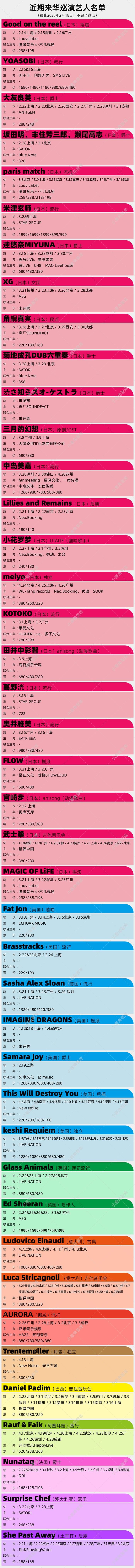 Live Nation主办的多是欧美艺人的中大型专场演出,包括意大利古典音乐家Ludovico Einaudi的四城巡演、英国迷幻流行乐队的Glass Animals的双城四场演出、美国艺人keshi Requiem和Sasha Alex Sloan的中国巡演。