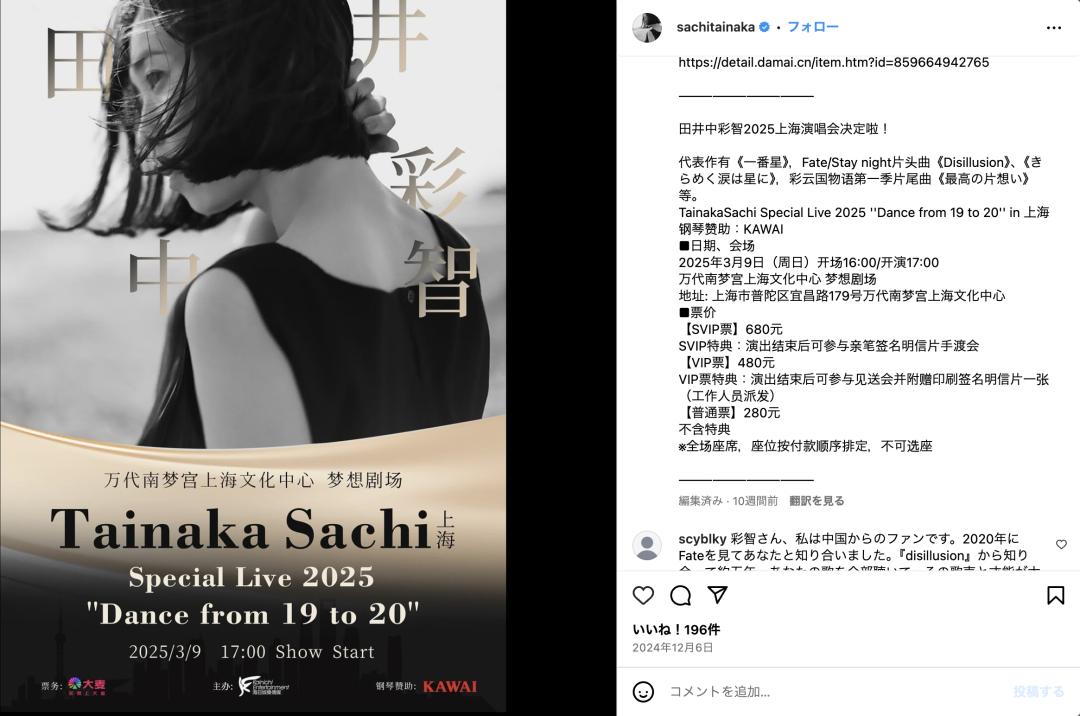 以日本创作歌手田井中彩智的票档为参考,其演出总共设置了三档票价,以满足不同乐迷的收藏需求。第一档是定价280元的普通票,不含特典,第二档是480元的VIP票,演出结束后可参与见送会并附赠印刷签名明信片一张(工作人员派发);第三档是680元的SVIP票,演出结束后可参与亲笔签名明信片手渡会。