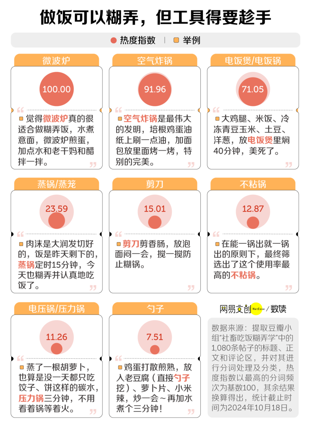 此外,如老话所言,工欲善其事,必先利其器。即便是糊弄做饭,也不能没有趁手的工具。和大道至简的厨神只需一口铁锅不同,能不开火就不开火的糊弄党,将目光投向微波炉、空气炸锅、电饭煲等懒人烹饪工具。