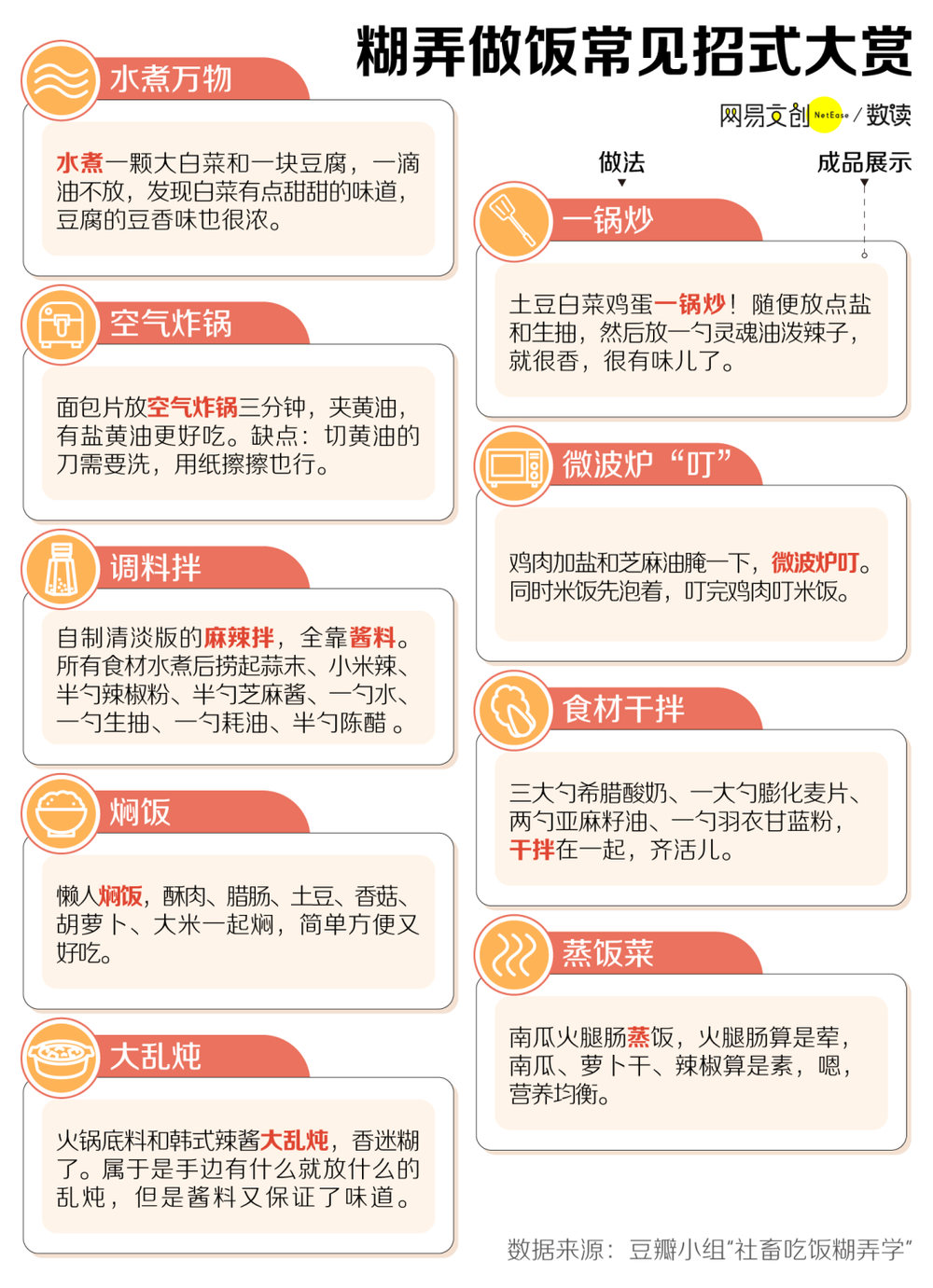 我们也对豆瓣“社畜吃饭糊弄学”小组里的糊弄姿势进行了整理,发现虽然“炒”是中国家庭最常见的烹饪手法,可轮到糊弄派亲自动手,首选的还是踏实且靠谱的“水煮万物”。