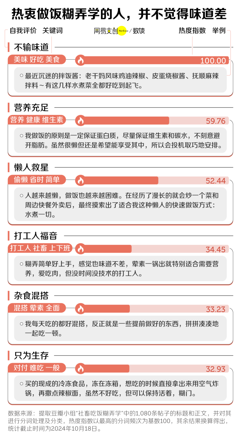 比如在豆瓣,近四万人齐聚“社畜吃饭糊弄学”小组,讨论怎么糊弄出来一顿饭,就像简介里写的那样:作为社畜,宝贵的时间怎能花费在做饭上面?