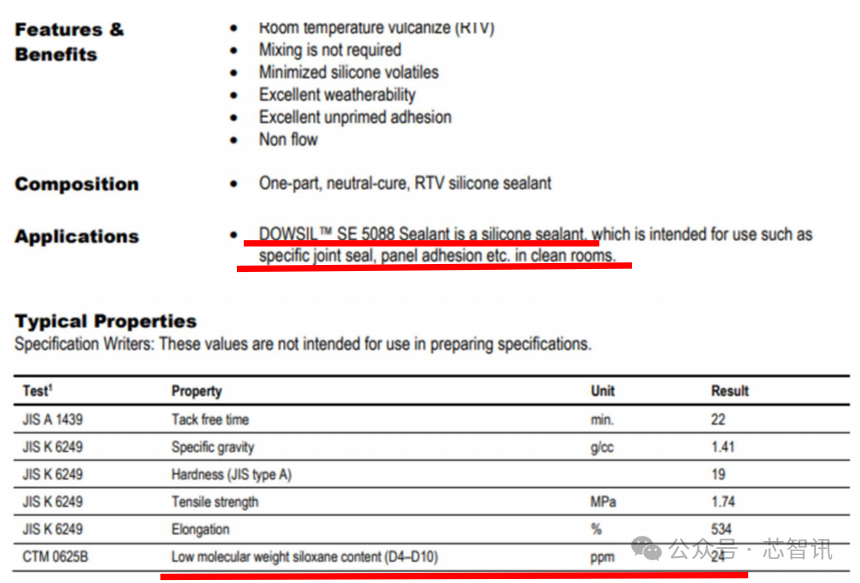还有一个厂家,叫做日本东丽(TORAY)。他们有一款 CORNINGSE9185 的密封胶,主要成分是单组分室温固化硅酮粘合剂,是一款还原型低分子量硅氧烷产品。还有一款CORNINGSE5088,主要成分是单组分醇基洁净室硅酮密封胶。产品 sds 有说明此产品含有的低分子硅氧烷在 24ppm 以下。因此该公司也强烈推荐此密封胶用于洁净室。
