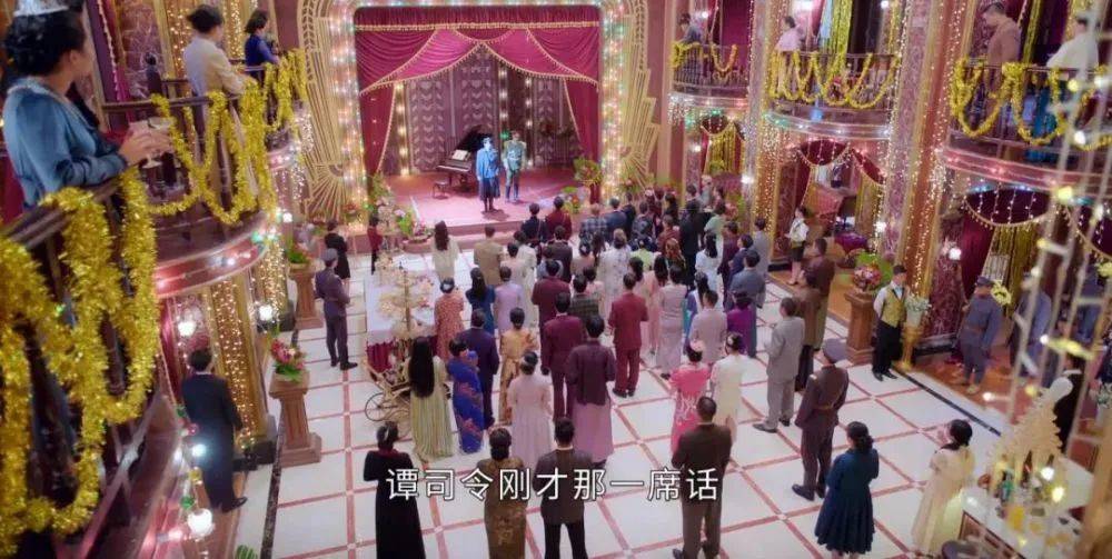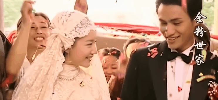等到了盛大的婚礼现场。新娘新郎牵手走入大门,两人是笑着的,配的却是哀乐,暗示一入豪门深似海。