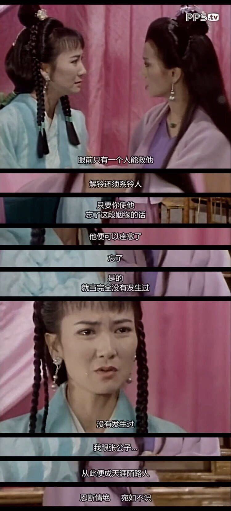然而,人妖殊途,天意难违,正当小青甜蜜自得之时,张公子一夜之间病倒了,形销骨立,不省人事。而破解这段“孽缘”的方法,就是由小青亲手将一个“忘”字,印在张玉堂的脑中。忘字心中绕,前缘尽勾消。小青心如刀割,泪流满面,但是为了救张公子,她不得不让他彻底遗忘自己,这其中的残忍,无与伦比。而那个“忘”字,从此成了小青心头的一把刀。小青悲苦的爱情,也让观众对她无比怜惜。