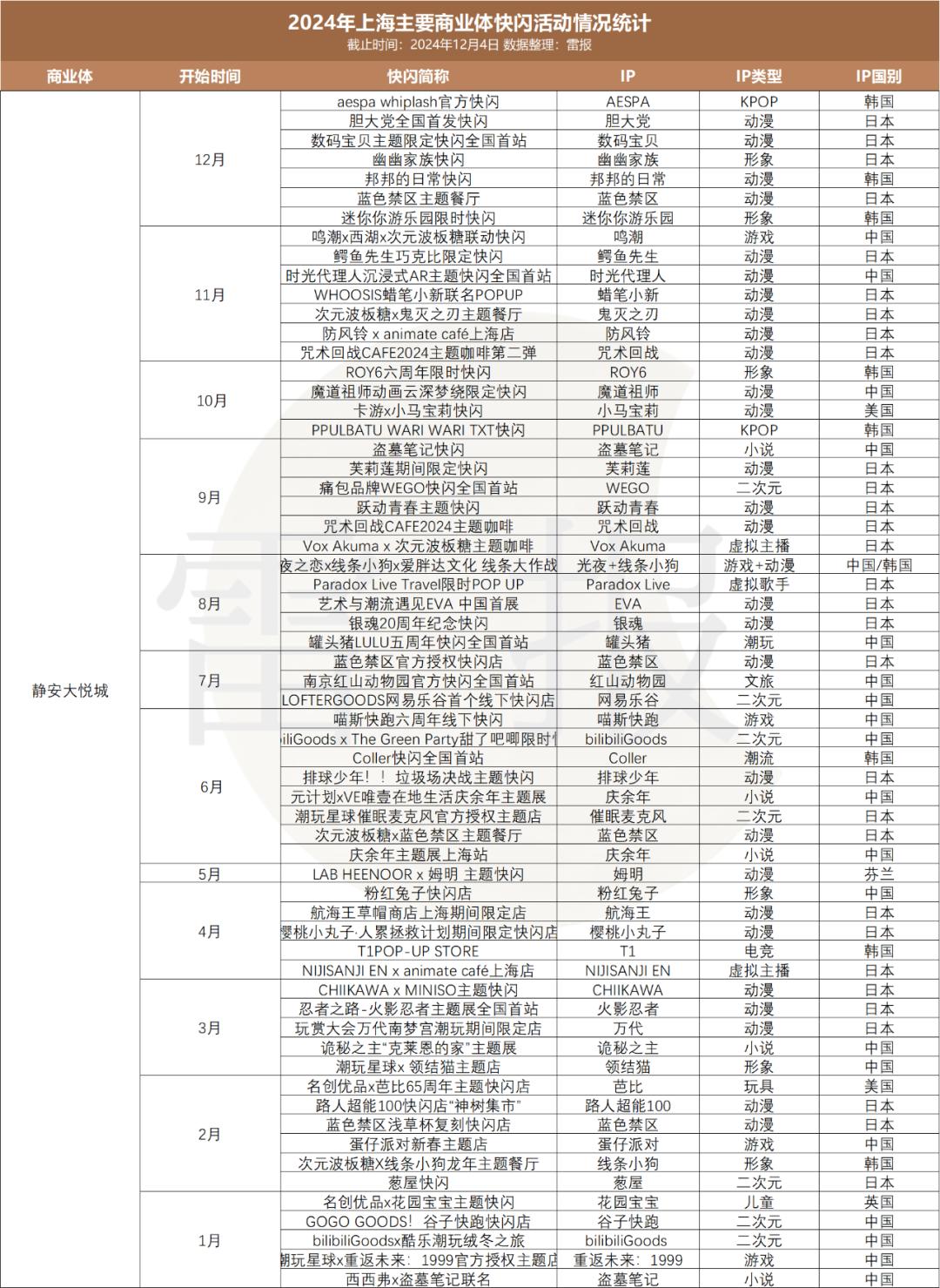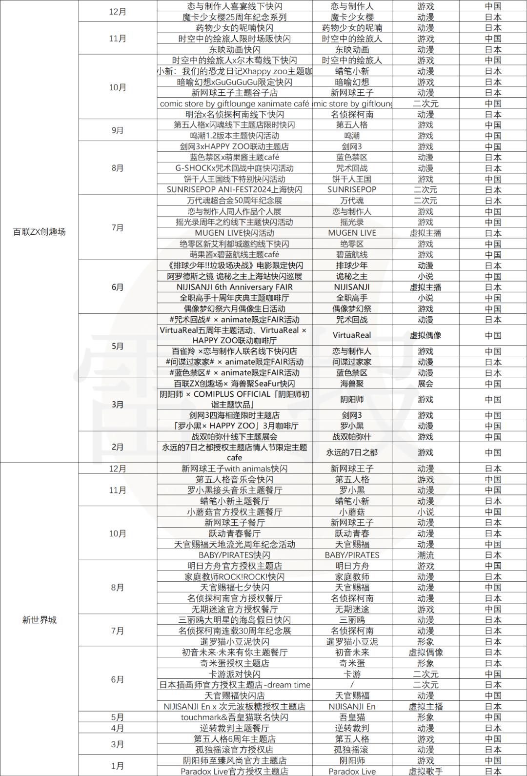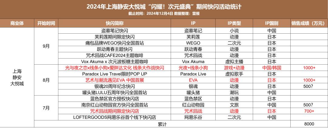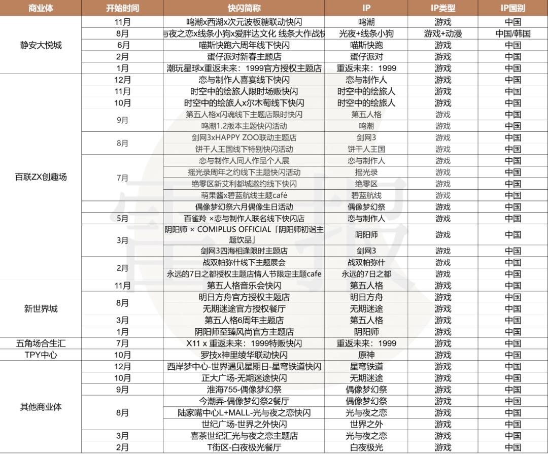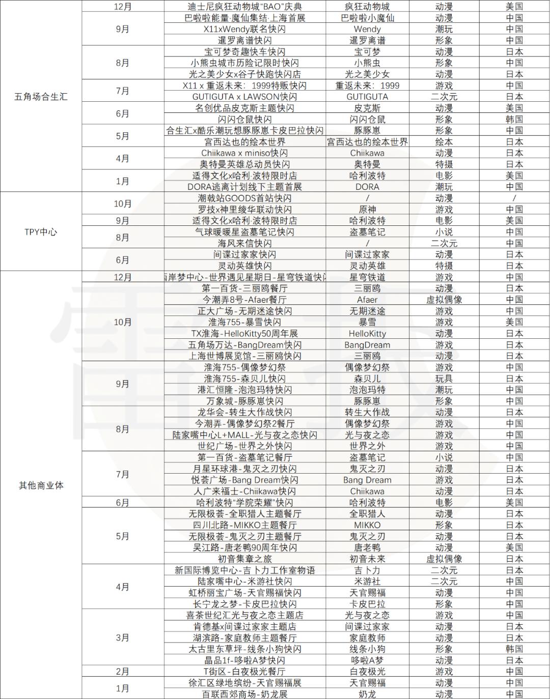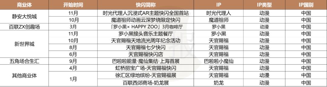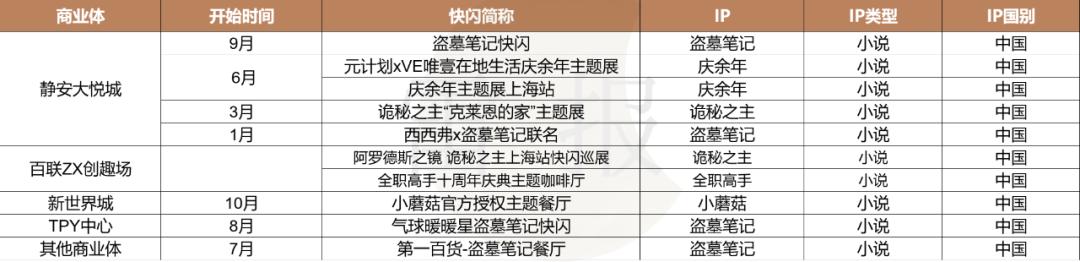 国产动漫IP和网文IP两者的表现相近,年内分别在上海有11场和10场快闪活动。相较于日漫 IP和国产游戏IP,国产动漫及网文IP在此轮二次元热潮中虽也有个别IP表现不俗,但整体受益的IP数量商业数据反馈可能都要更低一档。