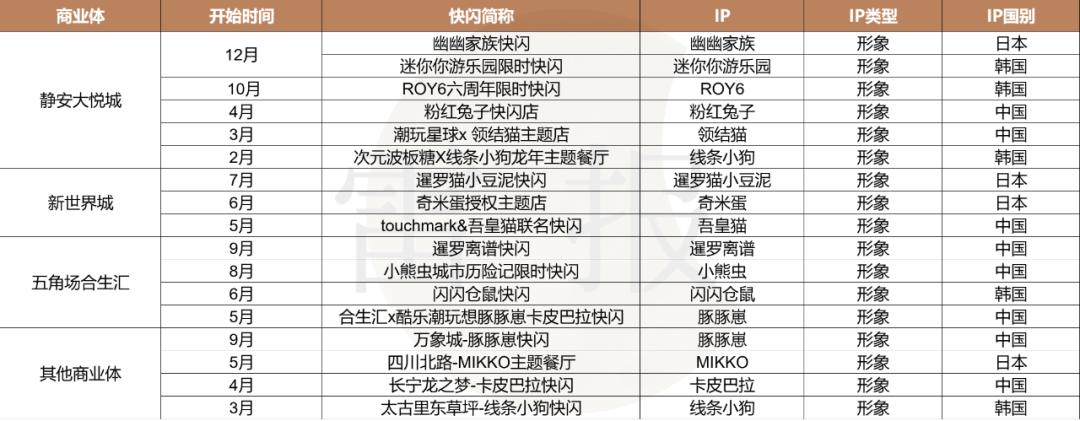 另外,从快闪活动的类型来看,除了一般意义上的快闪外,193场快闪活动中还有51场为IP联名主题店,并以主题餐厅和主题咖啡为主。