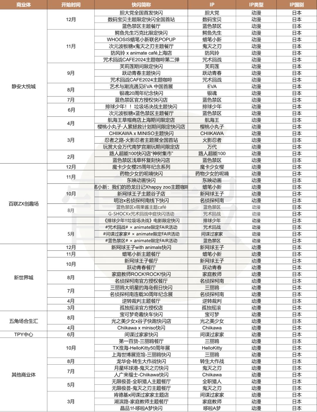 进一步细分来看,79次动漫IP的快闪活动中,日本的IP共有60次,其中推出快闪活动次数较多的IP有:“蓝色禁区”(6次)、“咒术回战”(4次)、三丽鸥及HelloKitty(4次)、“蜡笔小新”(4次)、“鬼灭之刃”(3次)、“间谍过家家”(3次)、“名侦探柯南”(3次)、“新网球王子”(3次)、“排球少年”(2次)、“Chiikawa”(2次)。