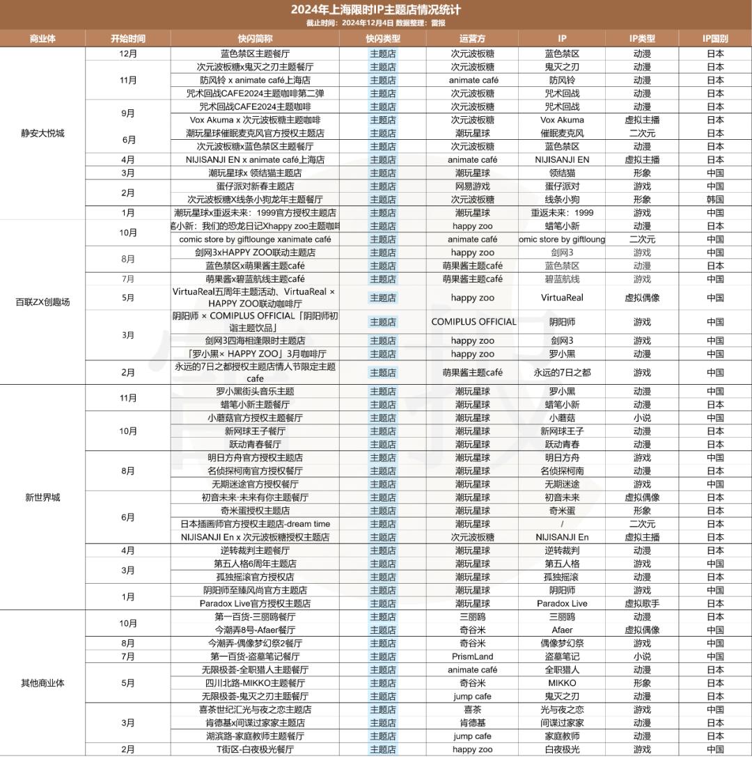 从上海地区年内举办的51场IP主题店的运营方可以看出,目前的入局者主要包括中国品牌潮玩星球、次元波板糖、奇谷米、三月兽、happy zoo、PrismLand、萌果酱主题café、COMIPLUS OFFICIAL,以及来自日本的animate café和shonen jump cafe等等。