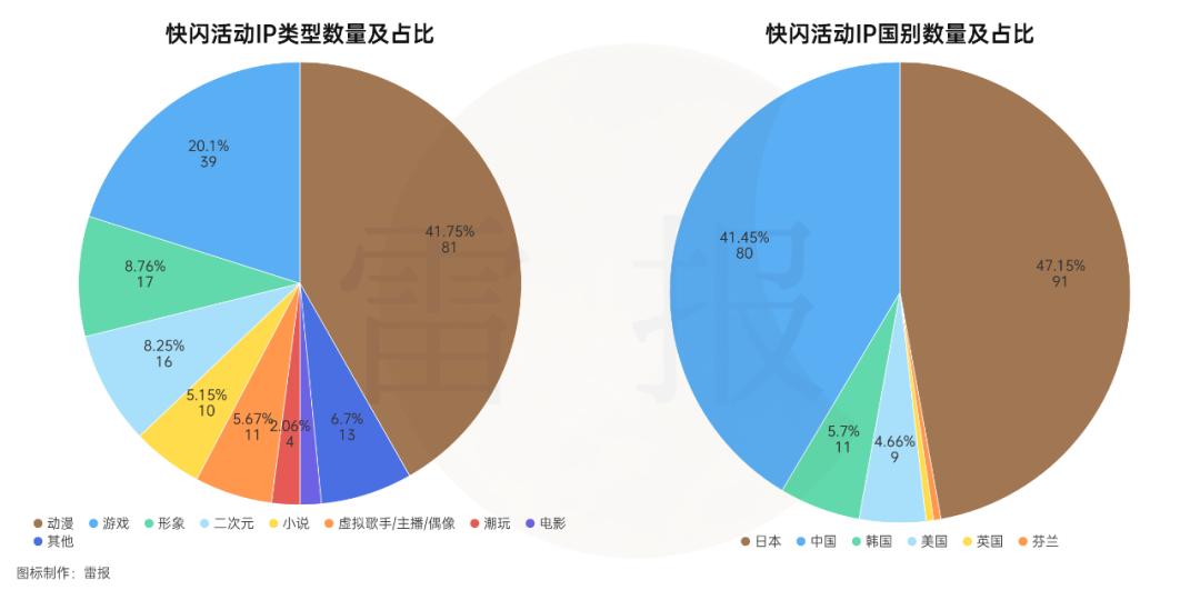 从IP类型来看,围绕动漫IP推出的快闪活动最多,共计有79次;其次为游戏IP,共计有41次;排在第三位的为表情包等形象IP,共计有17次。从IP国别来看,围绕日本IP进行的快闪活动最多,共计有89次;中国IP共计有82次,排在第二位;第三位的为韩国IP,共计11次;美国IP有9次。