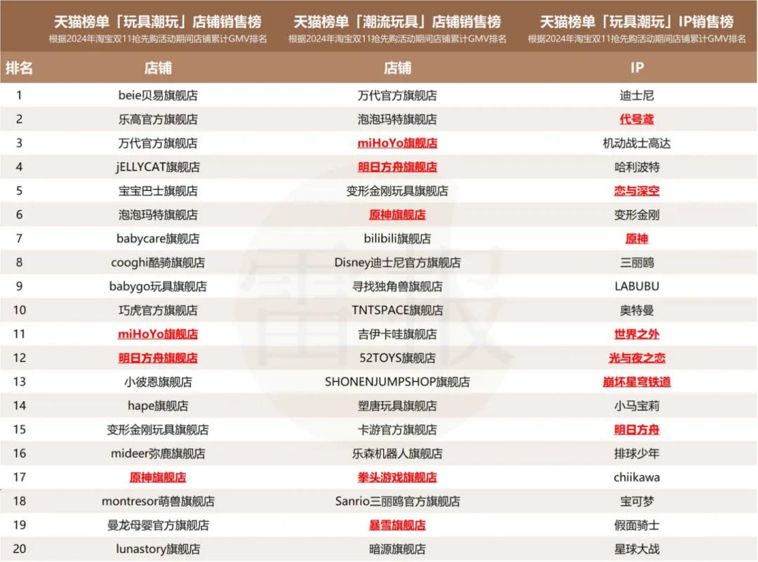 例如,今年双11,国产乙游和二游IP的衍生品“大放异彩”。开卖首日,包括叠纸心意、代号鸢在内的8个品牌成交破千万。在最终的淘宝、天猫的双十一【潮玩玩具店铺销售榜】中,国产游戏店铺更是占据了TOP20中的9席,且前十占六,冠亚军则分别被miHoYo旗舰店和叠纸心意旗舰店两大头部占去。