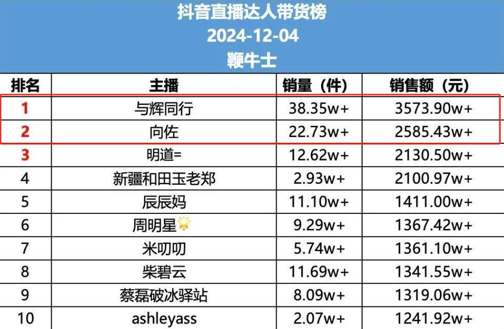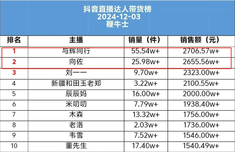 第三方数据显示,向佐首次直播带货当天,就吸引了1300多万人次观看。两日销售额均维持在2500万至5000万之间,在抖音带货榜单中排名第二,仅次于在直播电商行业大名鼎鼎的“与辉同行”。短短两日,向佐迅速涨粉近30万,粉丝量冲破250万大关。