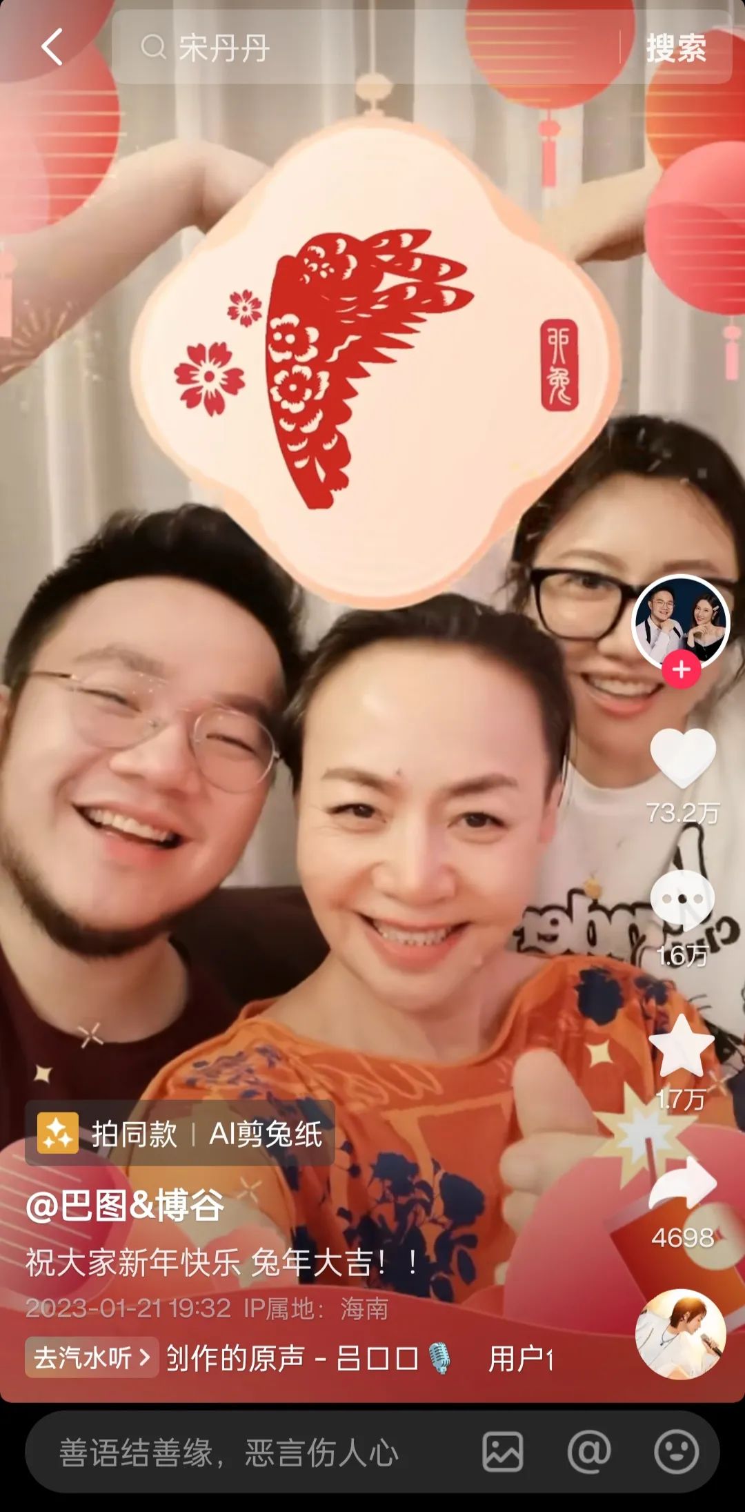 无独有偶,著名演员宋丹丹的儿子巴图,也同样在抖音带货,账号目前已经有890万粉丝。