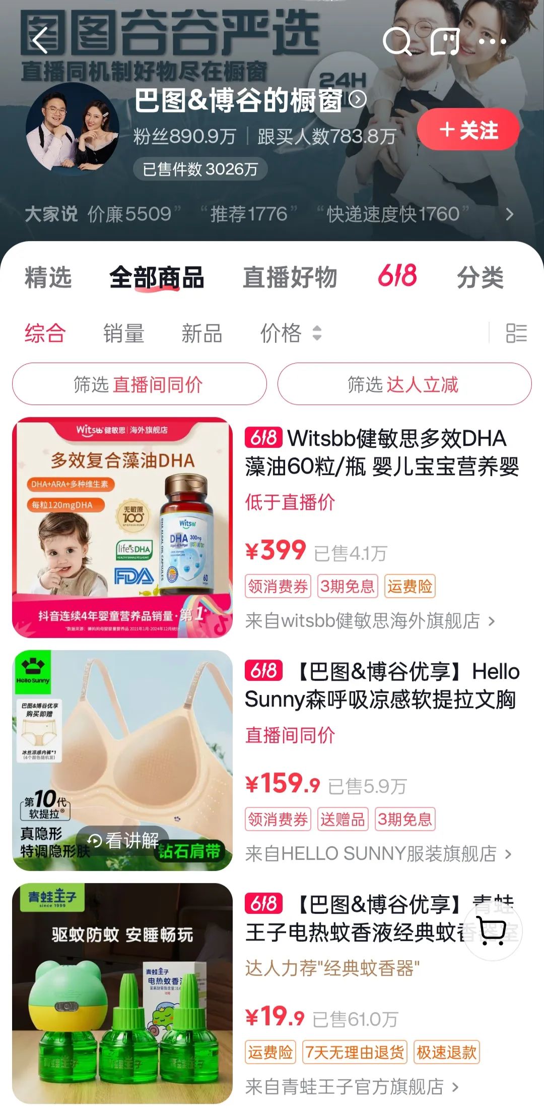 借着母亲的光环起步后,他又分享起和妻子博谷之间的生活趣事,吸引了不少观众,粉丝粘性较强,带货实力也颇为强劲。其抖音橱窗跟买人数783.8万,已售件数3026万,是长期积累的成果。