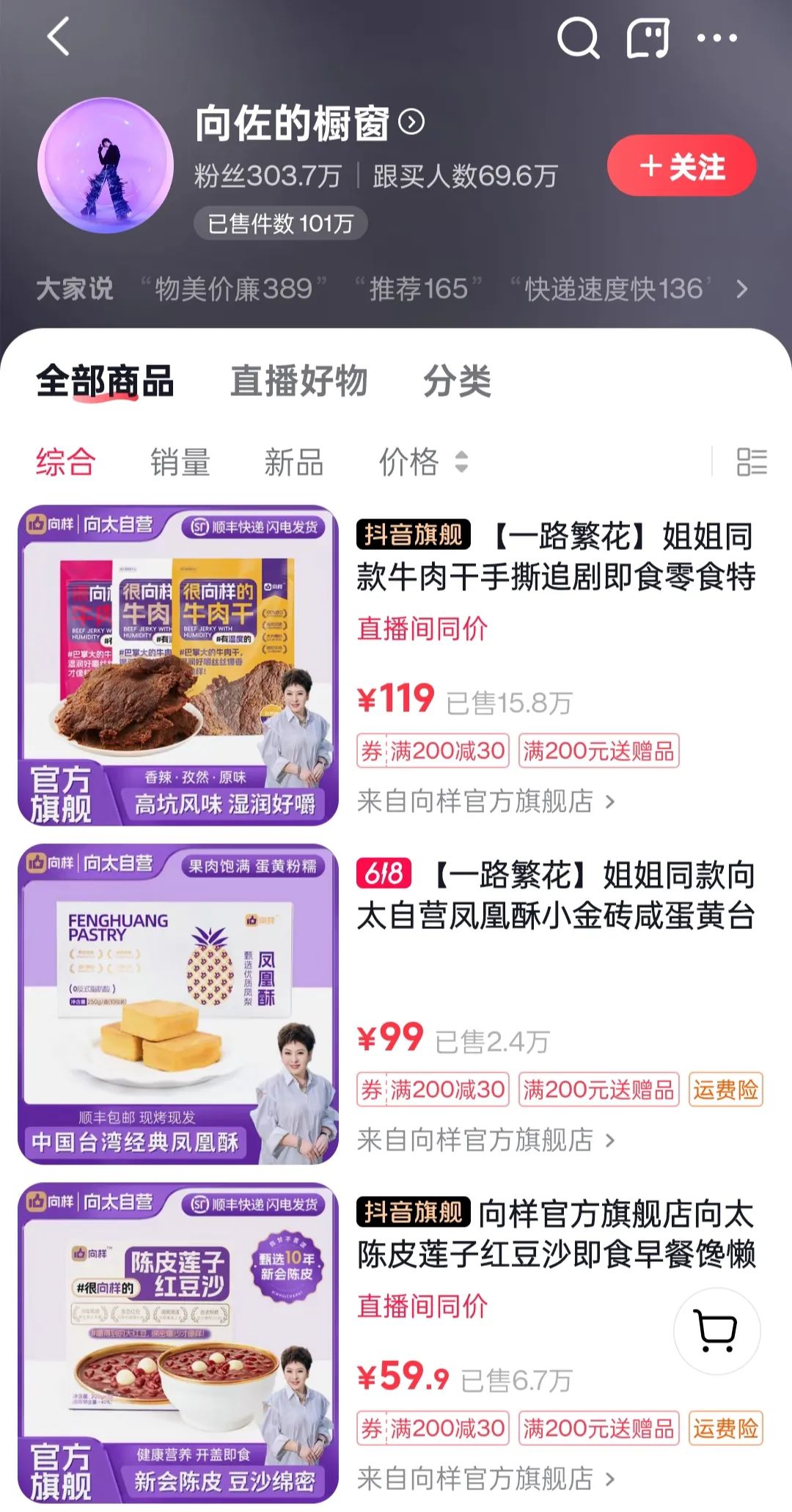 向佐目前在抖音上的粉丝也已经突破300万,抖音商品橱窗目前虽然只有6件商品,但跟卖人数将近70万,显示的已售件数也已经突破100万大关。