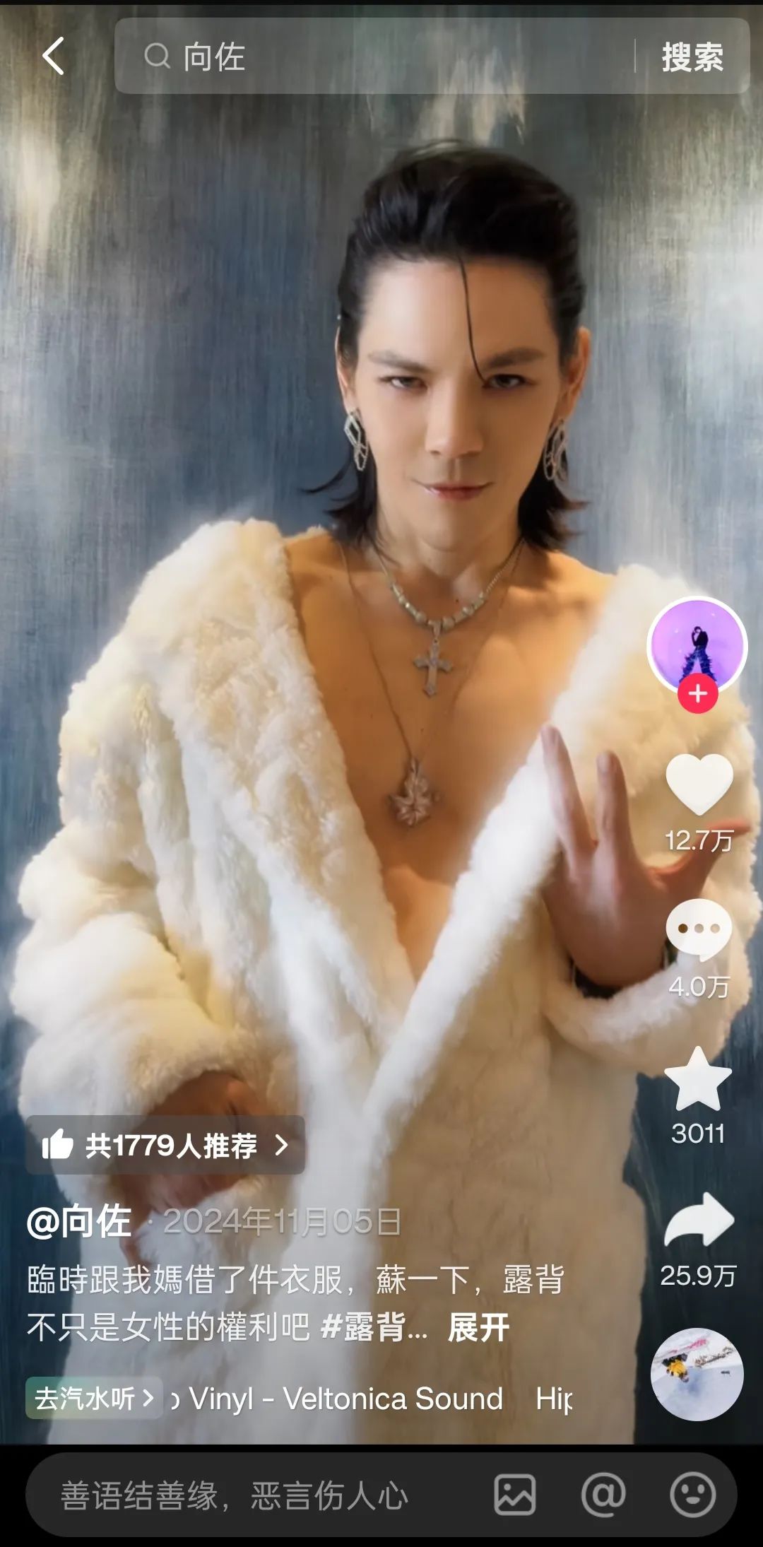 大胆又女性化的着装,让相关话题很快冲上热搜。而乘着这波流量的东风,向佐趁热打铁,于同年11月23日开启了一场直播间变装秀。