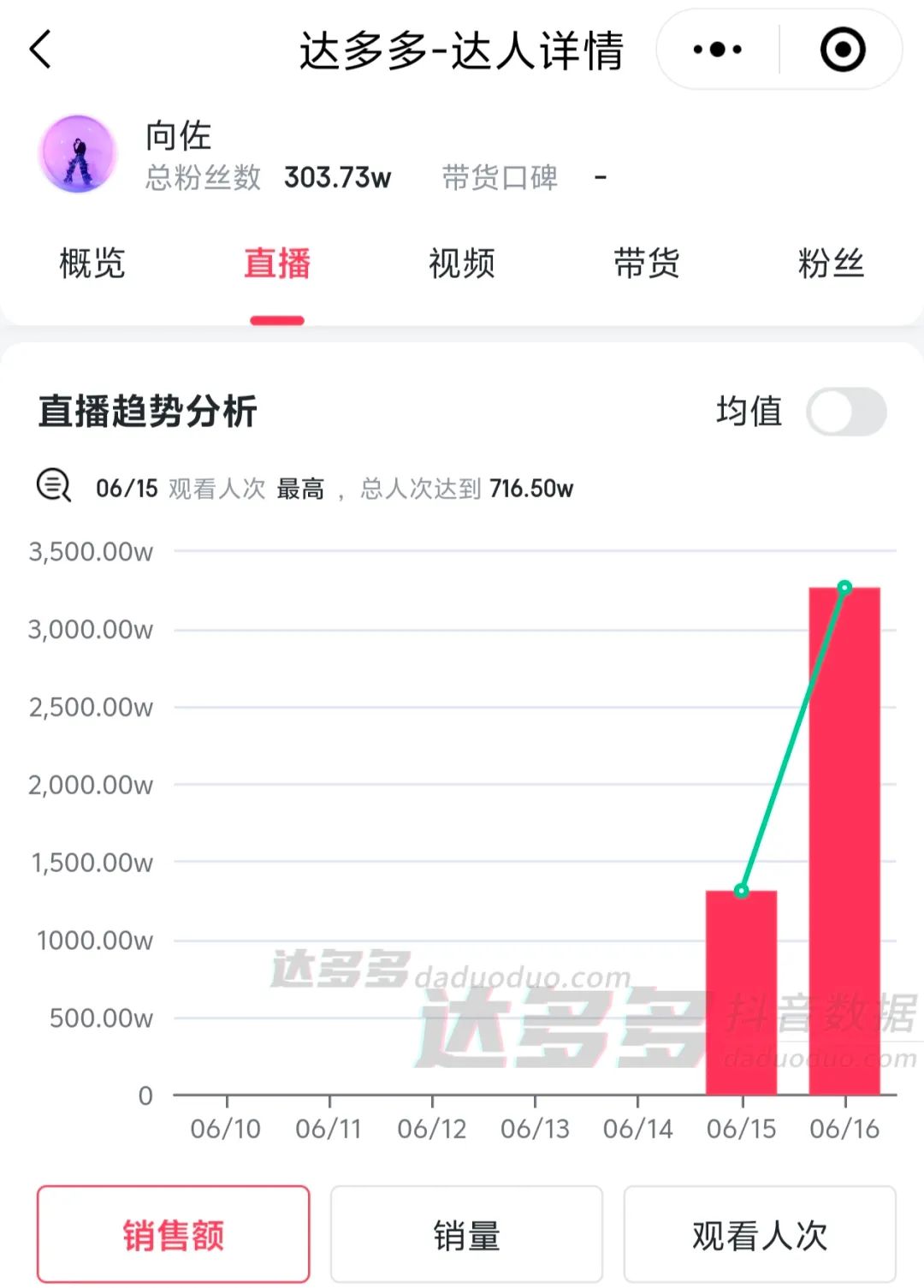 达多多数据显示,6月15日,向佐直播间的观看人次达到716.5万,近两日直播销售额都远超千万。