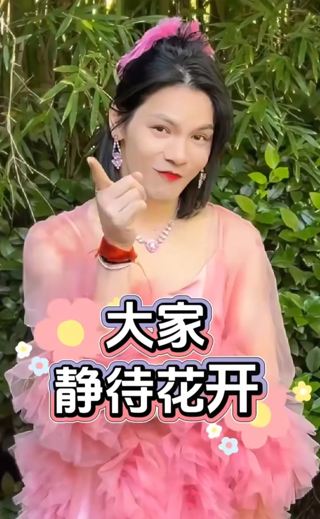 然后,他摇身一变,身着一袭粉色公主裙,神秘预告:“我‘向朵花’宣布,12月3日,静待花开”。