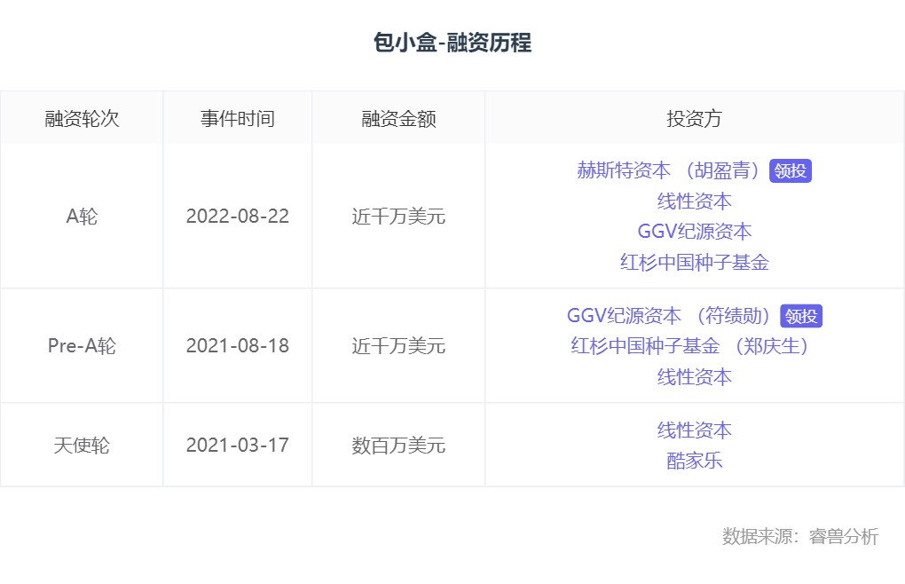 创业邦旗下睿兽分析的数据显示,包小盒在2021年3月获得数百万美元天使轮融资;5个月后拿到GGV纪源资本、红衫中国种子基金、线性资本近千万美元的Pre-A轮融资。拿到新一轮融资的包小盒志在发展海外业务,主打欧美市场。