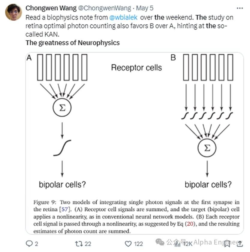 KAN论文发布后,有生物物理领域的专家提出:MLP更像大脑中的神经元,而KAN更像视网膜中的神经元。