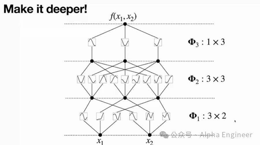 在这个基础之上,我们就可以把KAN网络建设得更深了,比如下图是一个三层的KAN。