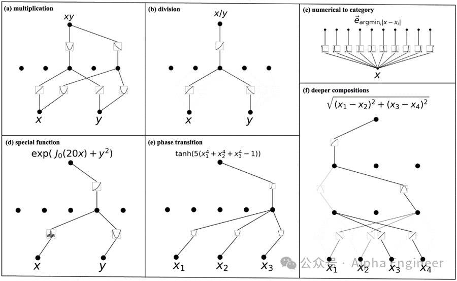 在(f)这个例子中,我们想要预测两个点在二维空间中的距离函数,这时需要一个三层的KAN网络,其中包括一个线性函数、一个平方函数、一个平方根函数。三层嵌套,就能够准确拟合出目标函数。