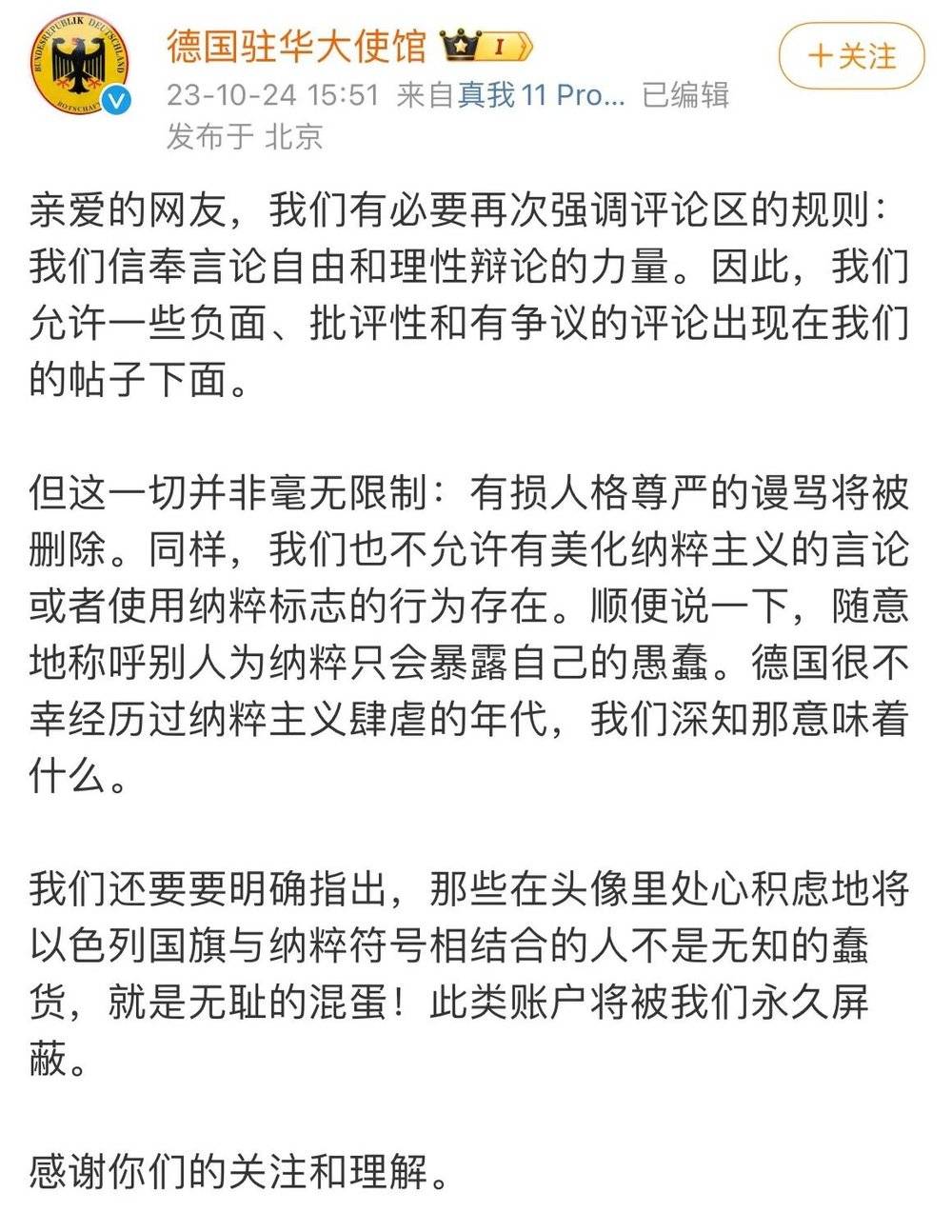 2023年10月24日,德国驻华大使馆也发布声明澄清:不要美化纳粹主义。