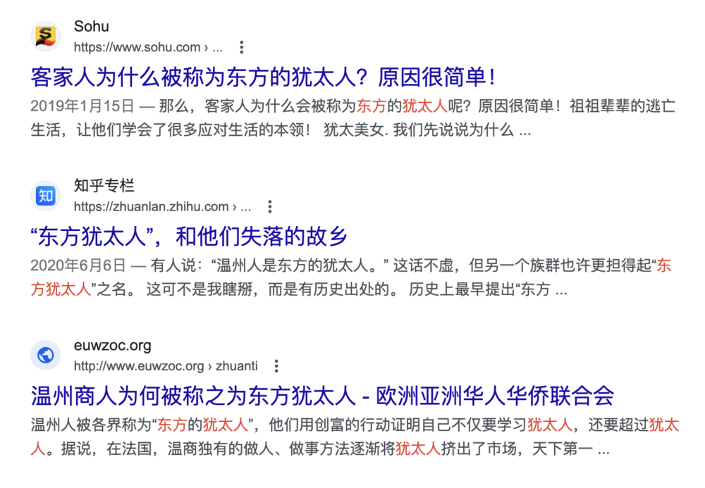 在改革开放深入阶段,犹太人变成了一种微妙的褒义词,表示精明算计、头脑灵光、会做生意。甚至搜索“东方犹太人”,关联的结果显示了“客家人”或“温州人”。
