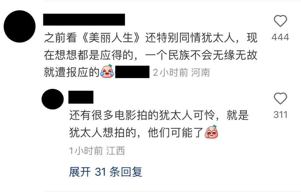 一系列情绪堆积导致的结果是,关于二战期间犹太人的电影被批为“犹太资本控制下的文化产物”,网友们一拍脑门:原来我们这些年都被骗了,他们的一切苦难都是咎由自取。