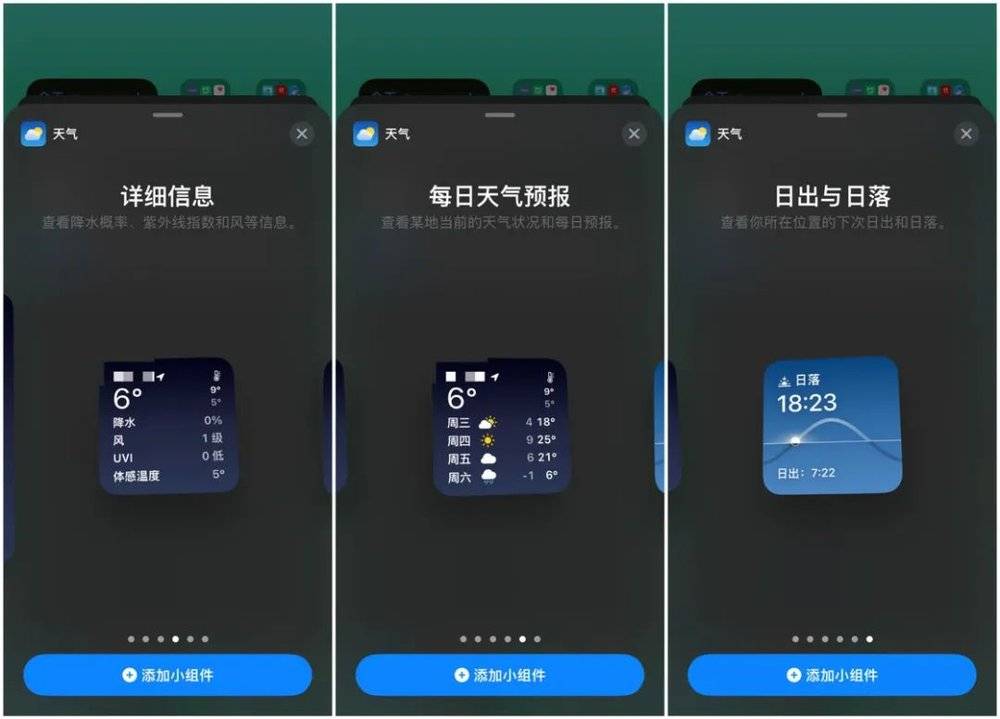 新版本中,Apple 为天气应用的桌面小组件新增了三个全新的样式,包括日出与日落、每日天气预报以及详细信息。