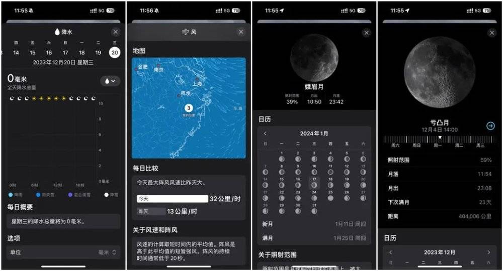 在 iOS 17.2 中,Apple 为天气应用新增了不少功能。首先是降水量 10 天预测,可以让我们通过这个功能掌握未来 10 天内的雨雪情况;在风力图中,Apple 加入了地图快照功能,可以为我们展示当前地点的风向情况;全新的月相日历可以让我们看到本月和接下去一个月内任意一天的月相情况,还可以通过时间轴来查看每小时的月相和月落、月出、照射范围等相关的参数。