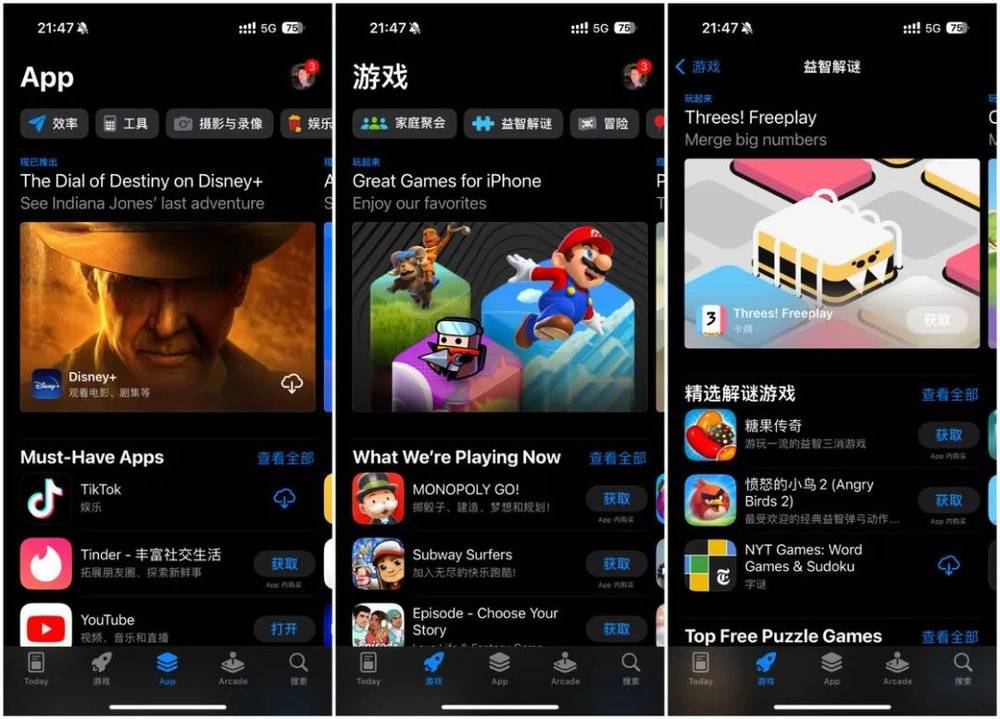 在新版本的 App Store 中,Apple 在 App 和游戏标签页将分类导航从页面底部移到了顶部,并更改了展示方式。