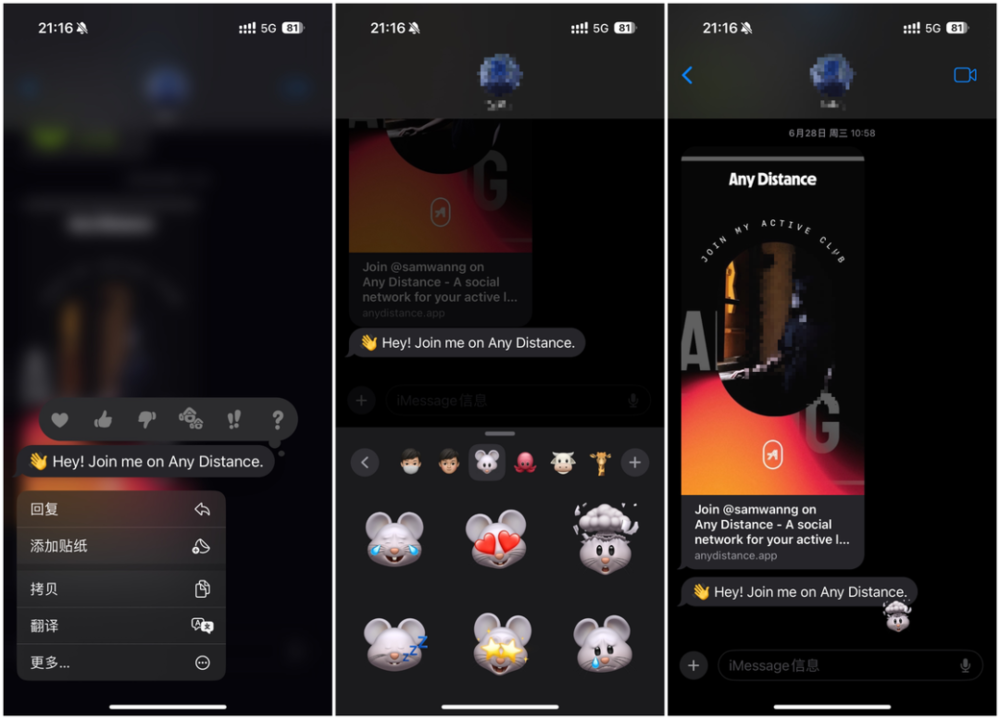 我们之前可以为信息 App 中的信息添加内置的 5 种反馈,包括爱心、赞、踩、哈哈、感叹号和问号等,在 iOS 17.2 中我们可以为信息添加贴纸,这里的贴纸可以是 Emoji、Memoji、Animoji、第三方应用提供的表情包,还可以是自己上传的图片,充分满足了大家 DIY 的需求。
