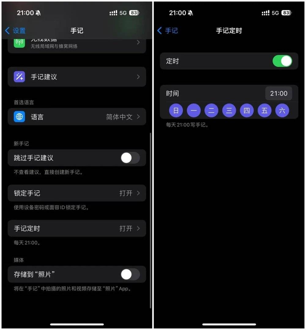 手记的设置不在应用内,也需要通过系统设置中的选项来进行。目前,手记设置提供了锁定手记、手记定时、储存到“照片”等功能,其中手记定时功能可以让我们设定每周提醒的日期和时间,以免遗忘当天的记录。