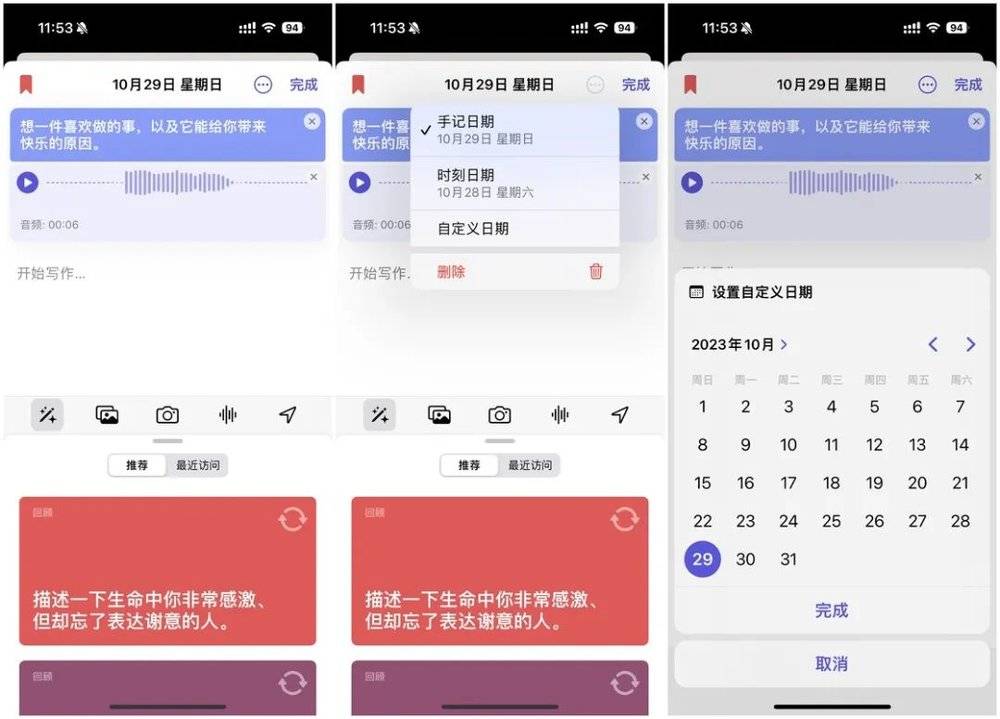 同时,点击左上角的书签按钮可以收藏当前的手记,点击右上角的“···”按钮则可以调整手记的日期。