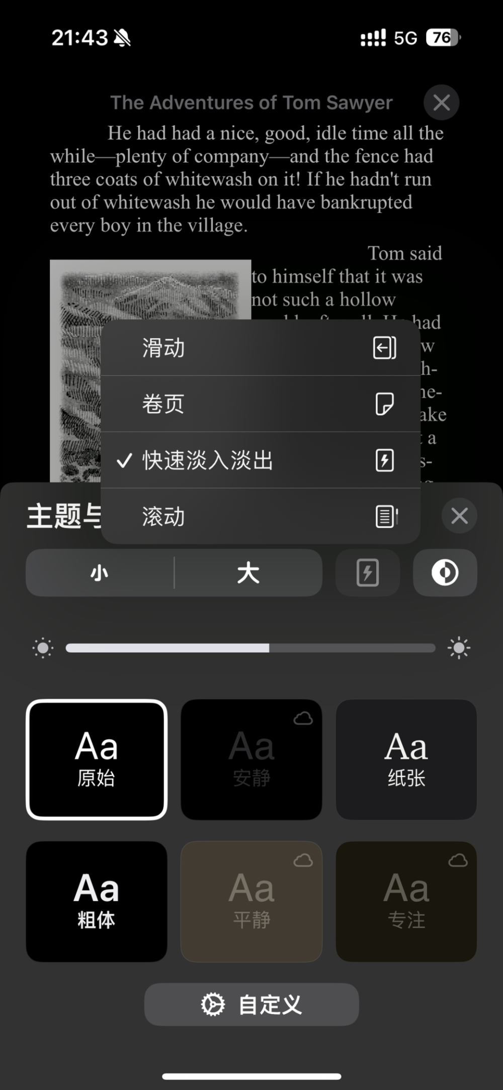 在图书 app 中,Apple 在新版本中为翻页效果新增了一个“快速淡入淡出”的选项,向左或者向右滑动屏幕时可以实现最简单高效的翻页效果,几乎没有任何的特殊动态效果。