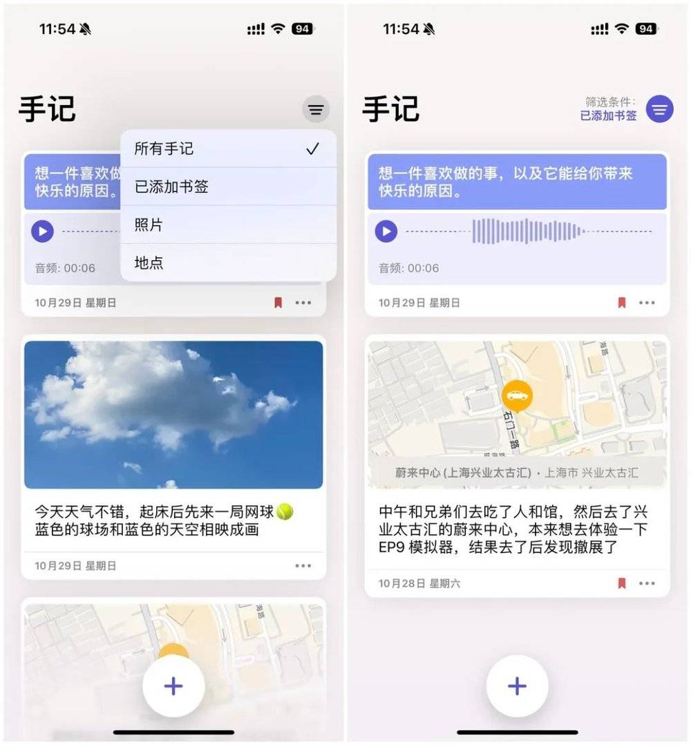回到主界面的时间线,手记在右上角提供了一个筛选功能,可以通过书签、照片、地点等要素来对手记进行筛选。