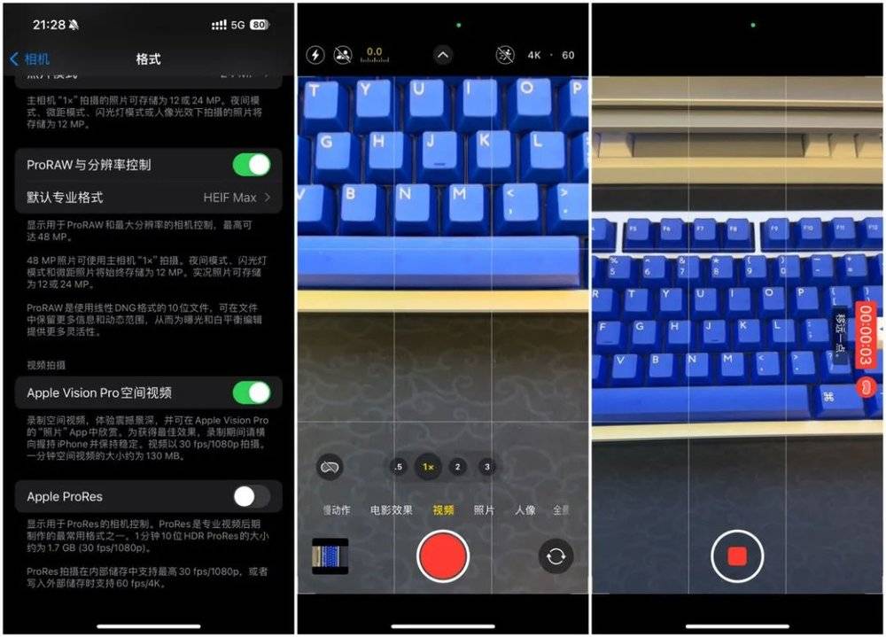 在新版本中,iPhone 可以在横屏状态下通过调用主摄像头和超广角摄像头来拍摄空间视频,录制的格式为 1080p 30 fps。在第一次使用空间视频录制前,需要先在“设置”>“相机”>“格式”中启用“Apple Vision Pro 空间视频”。开启后,在相机中会在视频拍摄界面的左下角出现一个开关按钮,点击后拍摄画面会自动横屏并进入空间视频拍摄模式。