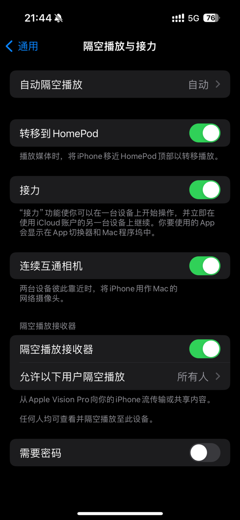 在 iOS 17.2 中,Apple 在“设置”>“通用”>“隔空播放与接力”中新增了一个“隔空播放接收器”,用来从 Apple Vision Pro 向 iPhone 流传输或者共享内容。