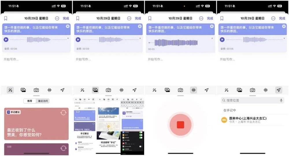 在编辑界面中,Apple 目前为手记提供了 5 个插入要素的选项,分别是话题、图片、拍照、音频和定位。