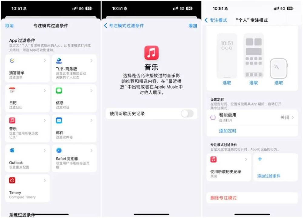 在 iOS 17.2 中,Apple 在专注模式下新增了音乐 App 过滤条件,可以让我们在开启专注模式的情况下关闭听歌历史记录,这样一来就不会对我们自己的音乐推荐和精选内容产生影响。