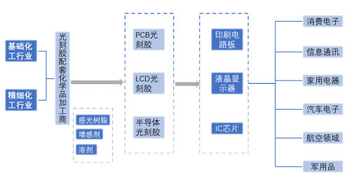 PCB光刻胶主要分为干膜光刻胶、湿膜光刻胶和阻焊油墨。其中,干膜光刻胶被广泛应用在PCB制造过程中。干膜光刻胶主要是在加热加压的条件下将干膜光刻胶亚和在覆铜板上,通过曝光、显影将底片上的电路图形复制到干膜光刻胶上,再利用干膜光刻胶的抗蚀刻性能,对覆铜板进行蚀刻加工,最终形成印制电路板的精细铜线路。