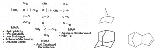 干法光刻胶也属于化学放大光刻胶,出行源自IBM,1991年IBM设计出:甲基丙烯酸甲酯、甲基丙烯酸丁酯和甲基丙烯酸三元共聚物,其中甲基丙烯酸丁酯起到了光致产酸剂的作用,通过调整各组分的比例可以实现对光刻胶性能的微调。虽然该体系因不耐干刻蚀而不具有直接实用价值,后续各厂商通过在侧链引入保护性基团(富碳基团:金刚烷、降冰片烷、三环癸基)来提高其耐干刻蚀性能。