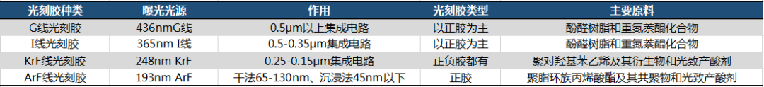 半导体行业发展的过程反复印证了摩尔定律,其先进制程代表了整个电子行业最高技术水平,相应的高端光刻胶需求最大。目前主要的光刻胶由G线光刻胶、I线光刻胶、KrF光刻胶和ArF光刻胶四种。