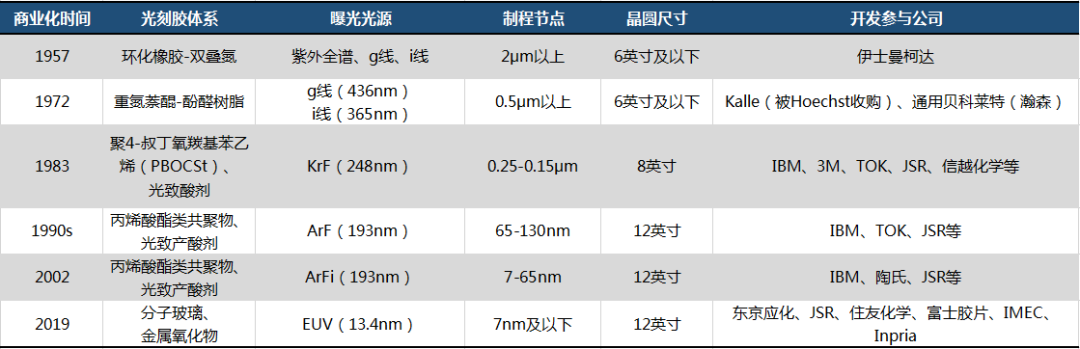 回顾光刻胶的发展史,驱动其体系的演变主要来源是先进制程的半导体行业对光刻胶高分辨率、高对比度、高敏感度的要求。光刻胶发展主要可以分为三个阶段:全谱及紫外光刻胶、化学放大光刻胶、EUV光刻胶。