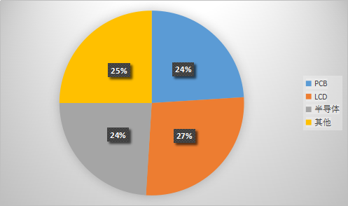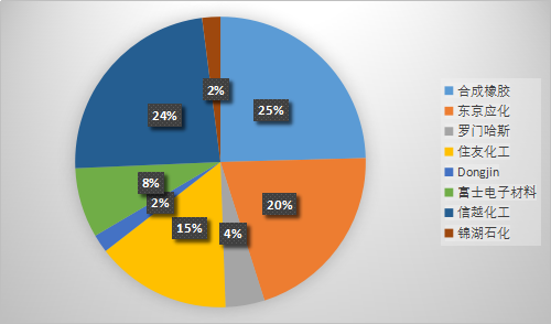 根据使用对象不同,可分为RGB胶(彩色胶)、BM胶(黑色胶)、OC胶、PS胶、TFT胶等。平板显示器领域,TFT-LCD是市场的主流,彩色滤光片是TFT-LCD实现彩色显示的关键器件,占面板成本的15%左右;彩色光刻胶和黑色光刻胶是制备彩色滤光片的和新材料,占彩色滤光片成本的27%左右。TFT-LCD用光刻胶技术壁垒较高,市场基本JSR、住友化学、三菱化学等日韩公司占领,占有率达到90%。