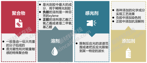 光刻胶具有特定的热流稳定特征,用特定的方法配制而成,与特定的表面结合。其属性是由光刻胶不同化学成分的类型、数量和混合过程来决定的。光刻胶主要有4种基本成分组成,包括聚合剂、溶剂、感光剂和添加剂。