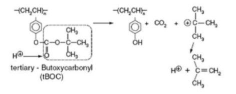IBM领导了对化学放大光刻胶的研发,Ito和Willson等人以聚4-羟基苯乙烯作为树脂材料,并且加入t-丁氧基羰基(t-BOC)保护羟基,得到了PBOCST。在248nm深紫外光下,PAG产生的酸会打开t-BOC保护基团,光刻胶溶解性发生显著变化,且光敏性极高。
