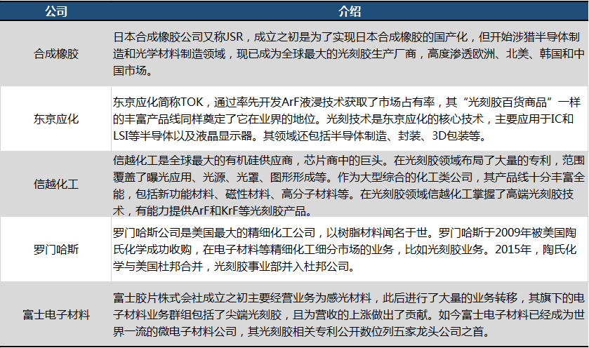 光刻胶行业目前主要五家头部公司——东京应化、合成橡胶、信越化工、罗门哈斯、富士电子材料(除罗门哈斯外均为日本企业)垄断约90%市场份额,使得光刻胶市场头部集中化明显。日本掌握了光刻胶开发技术,高技术壁垒使得目前垄断局面短时间内难以发生逆转。五家公司在光刻胶领域各有优势,但其中有四家并非一开始就以光刻胶为目标产品,且都有非常丰富而分散的产品线。仅东京应化一家以光刻胶技术为战略切入点获取巨大市场份额,但此后公司同样开始发展丰富的电子产品线,从中可见这些电子材料巨头的经营模式都是试图成为有能力覆盖半导体产业链的企业,以分散微电子材料生产的风险。